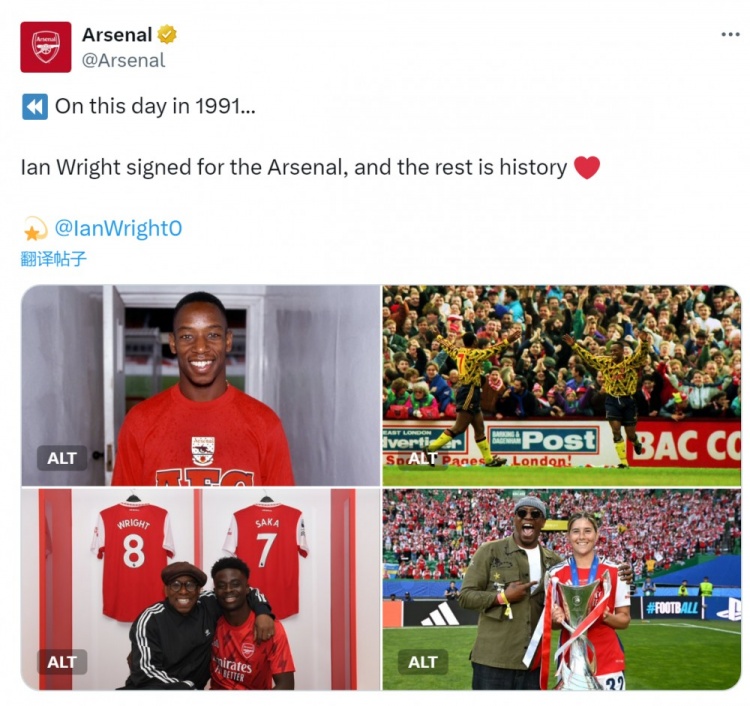 9月23日讯 34年前的今天,伊恩-赖特加盟阿森纳,枪手官方社媒晒照片回顾。1991年9月23日,伊恩-赖特从水晶宫加盟...