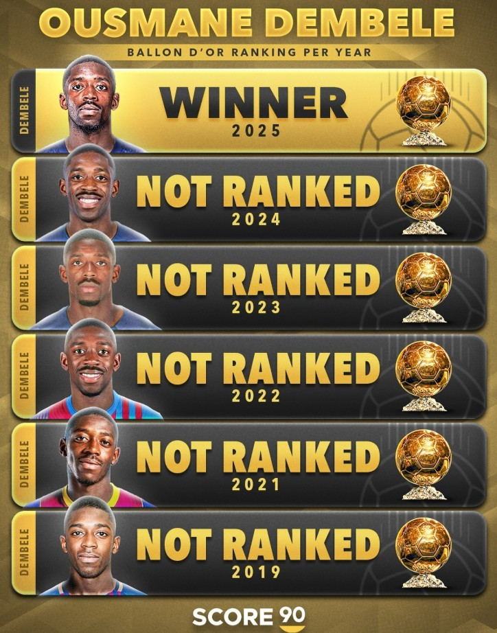 法国足球主编透露金球奖得票:登贝莱获压倒性支持,赢得毫无争议