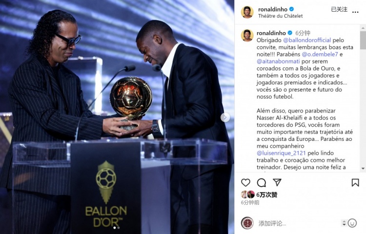 小罗社媒晒颁奖照片:感谢金球奖的邀请,祝贺登贝莱、邦马蒂获奖