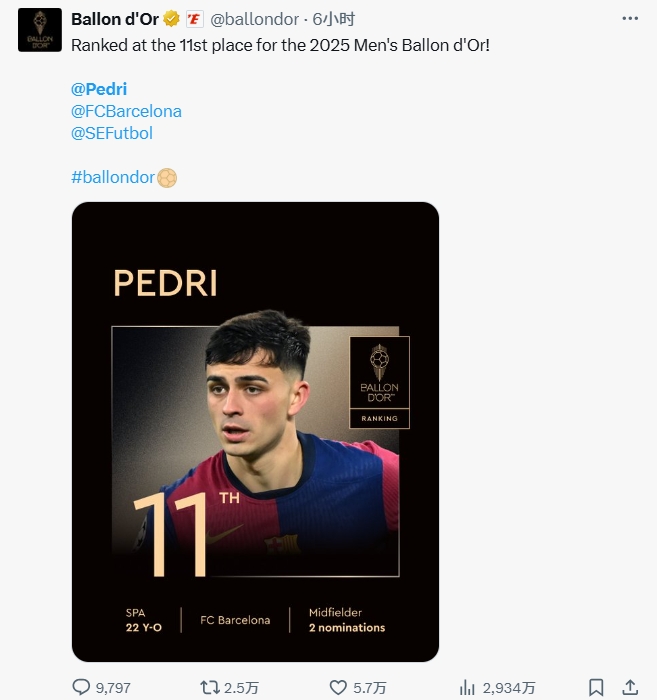 09月23日讯 2025年金球奖颁奖典礼在北京时间今天凌晨进行,佩德里仅排在第11位。在金球奖官方发布的社媒下,佩德里排...