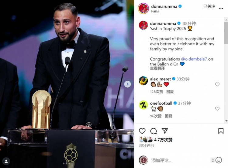 多纳鲁马社媒:很自豪获得2025年雅辛奖,祝贺登贝莱斩获金球