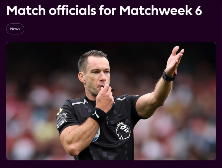 英超第6轮裁判:吉莱特执法纽卡阿森纳,胡珀执法切尔西布莱顿