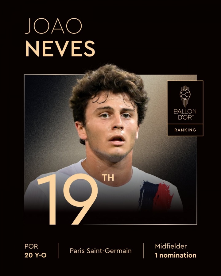 9月23日讯 2025年金球奖排名陆续公布,巴黎中场若奥-内维斯获得第19名,生涯首次提名。若奥-内维斯现年20岁,上赛...