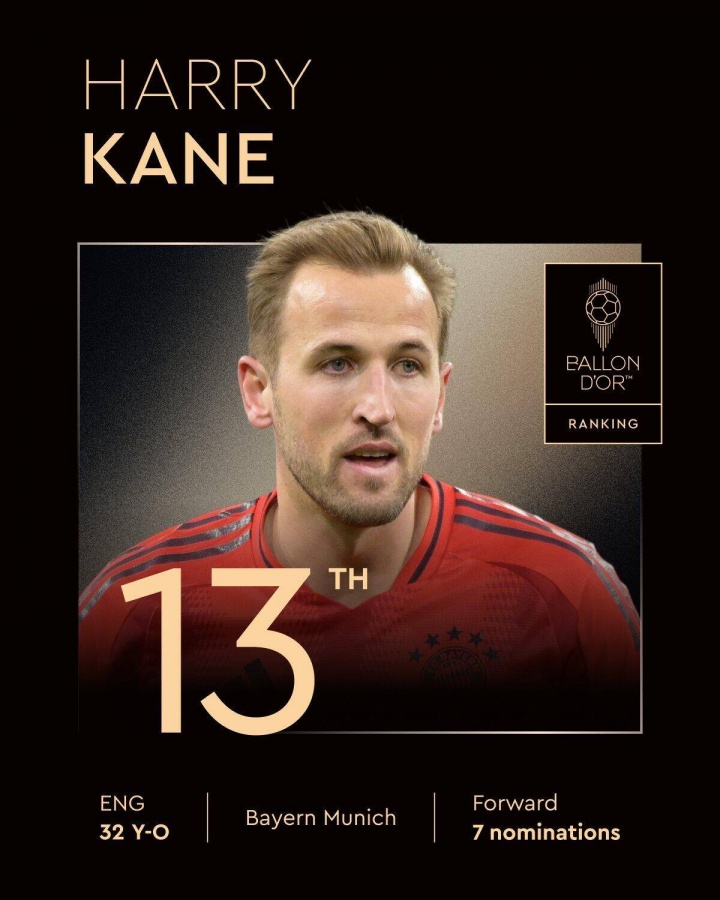 2025年金球奖第13名:凯恩,7次提名,上赛季38球12助+个人首冠