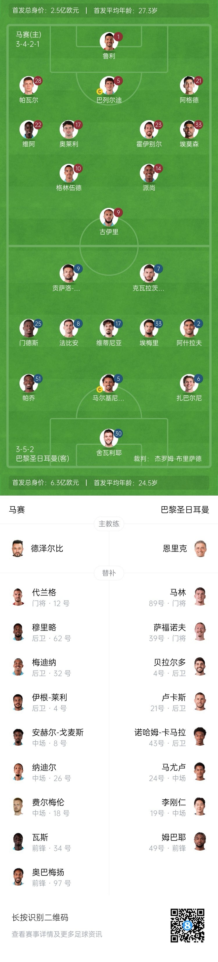 马赛vs巴黎首发:维蒂尼亚、K7先发,格林伍德、帕瓦尔出战