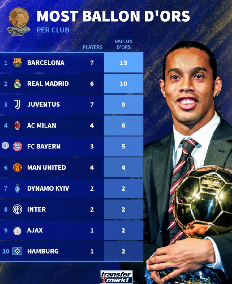 俱乐部球员夺金球次数排名:巴萨7人13次居首,皇马6人10次第2