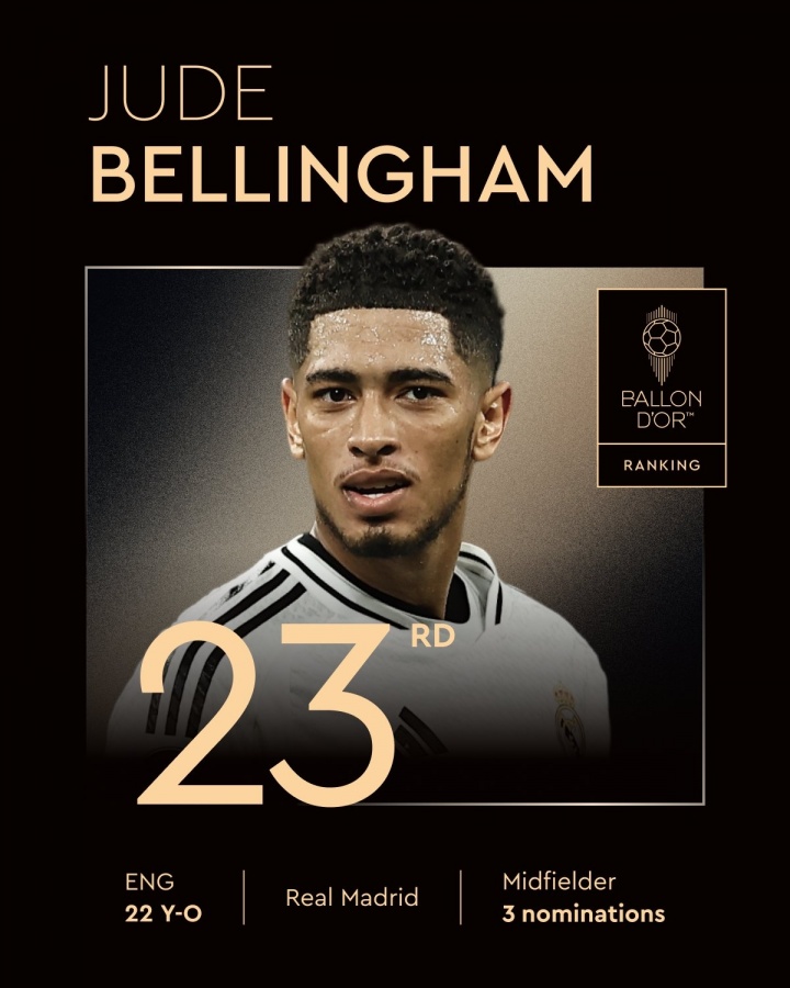 上赛季出战58场进球助攻15+15,金球奖第23名:贝林厄姆