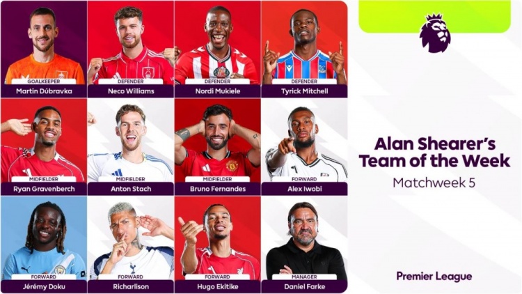 9月23日讯 英超第5轮战罢,传奇球星阿兰-希勒评出了本轮的最佳阵容。门将:杜布拉夫卡(伯恩利)后卫:内科-威廉姆斯(森...
