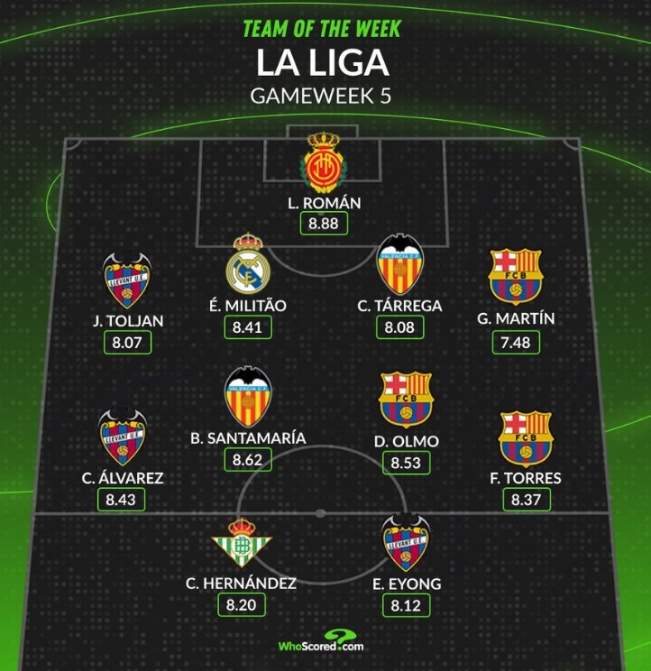 Whoscored评本轮西甲最佳阵:费兰等巴萨三将领衔,米利唐在列