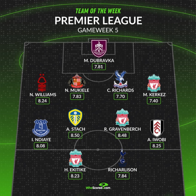WhoScored英超第5轮最佳阵:埃基蒂克、理查利森在列,利物浦3人