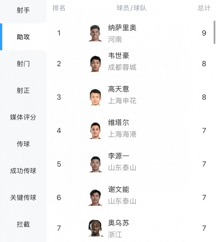 中超助攻榜:纳萨里奥9次登顶,韦世豪、高天意8次