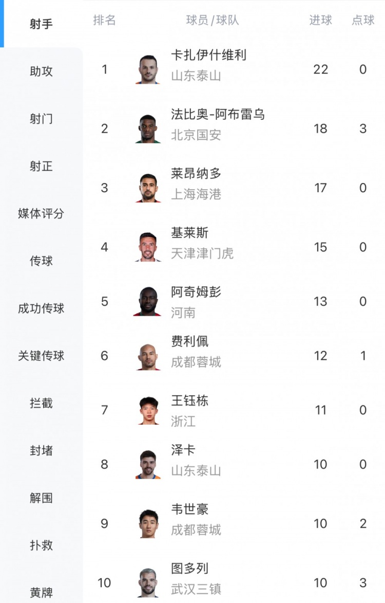 中超射手榜:瓦科22球领跑,莱昂纳多戴帽17球升至第三