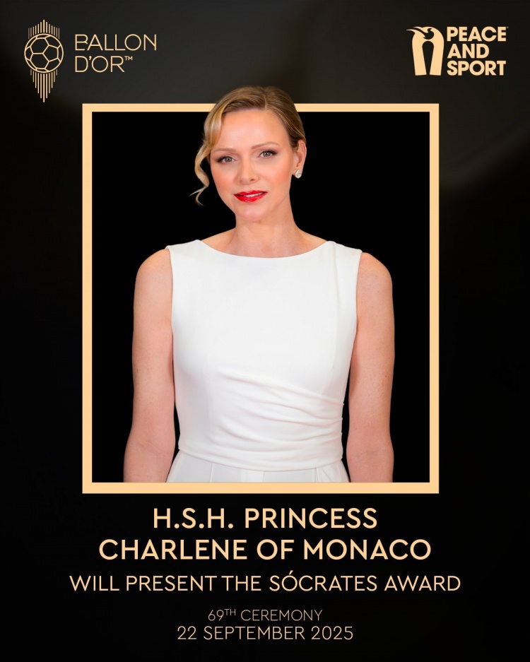 官方:苏格拉底奖将由摩纳哥夏琳王妃颁发,她曾是奥运游泳选手