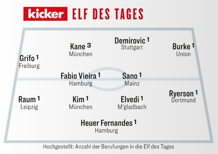 踢球者本轮德甲最佳阵:凯恩、金玟哉领衔,法维和佐野海舟入选
