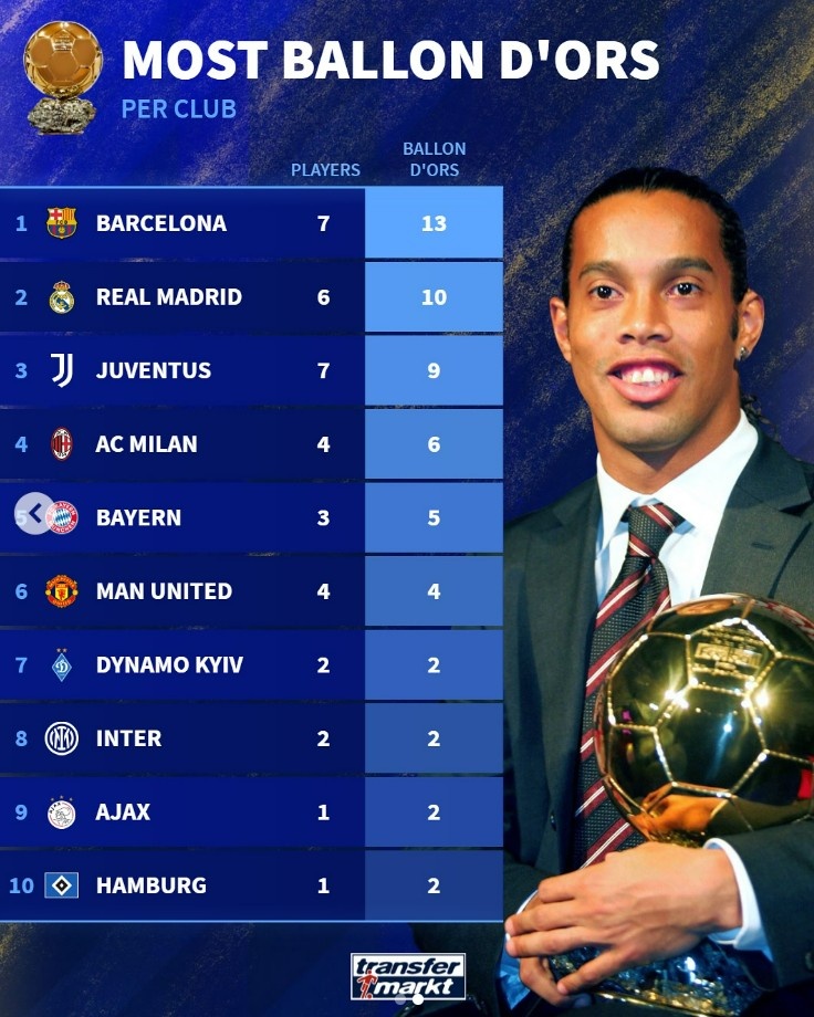 各俱乐部球员获得金球奖次数:巴萨13次居首,皇马10次第二