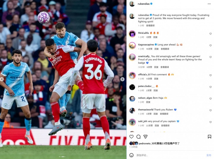 9月22日讯 在本轮英超,阿森纳1-1战平曼城。曼城球员鲁本-迪亚斯也在社媒晒出本场照片,配文写道:“为今天全队的拼搏精...