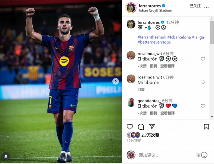 9月22日讯 西甲第5轮比赛,费兰-托雷斯梅开二度,帮助巴萨主场3-0击败赫塔费。费兰-托雷斯赛后在社交媒体上晒出照片,...