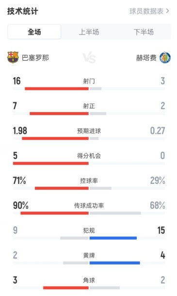 全面压制!巴萨3-0赫塔费数据:射门16-3,射正7-2,控球71%-29%