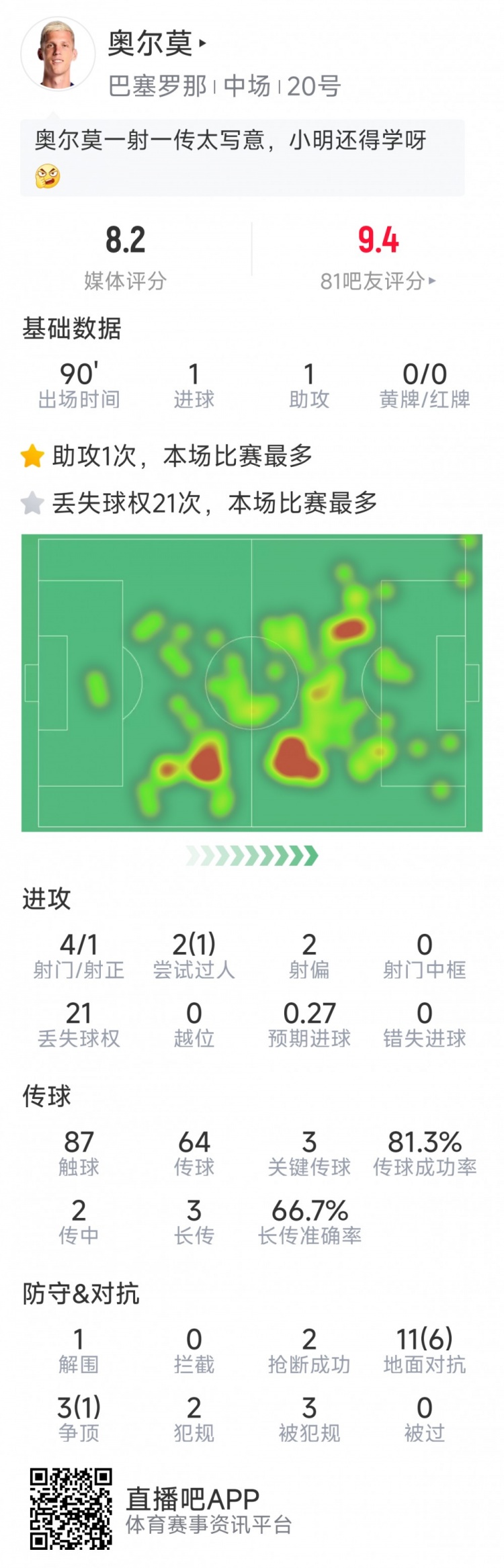 奥尔莫本场数据:1球1助攻,4射1正,3次关键传球,2次抢断
