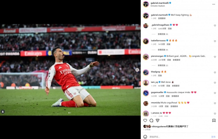 9月22日讯 在本轮英超,阿森纳1-1战平曼城。本场比赛马丁内利在替补登场后补时绝平,赛后他也在社媒晒出滑跪庆祝进球照片...