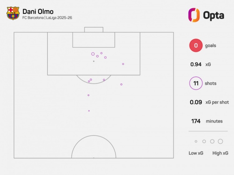奥尔莫本赛季西甲11次射门未破门,仅两名未破门球员射门次数更多