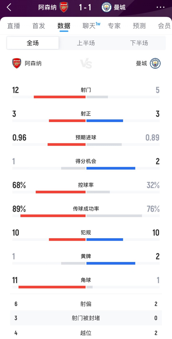 阿森纳vs曼城全场数据:控球率68%-32%,射门12-5,角球11-1