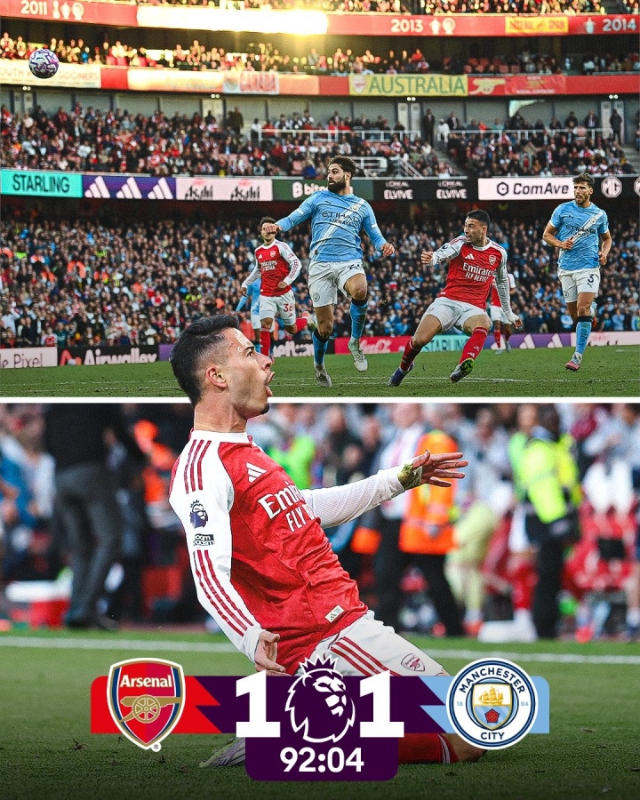93分钟绝平!阿森纳1-1曼城 哈兰德破门马丁内利补时吊射扳平