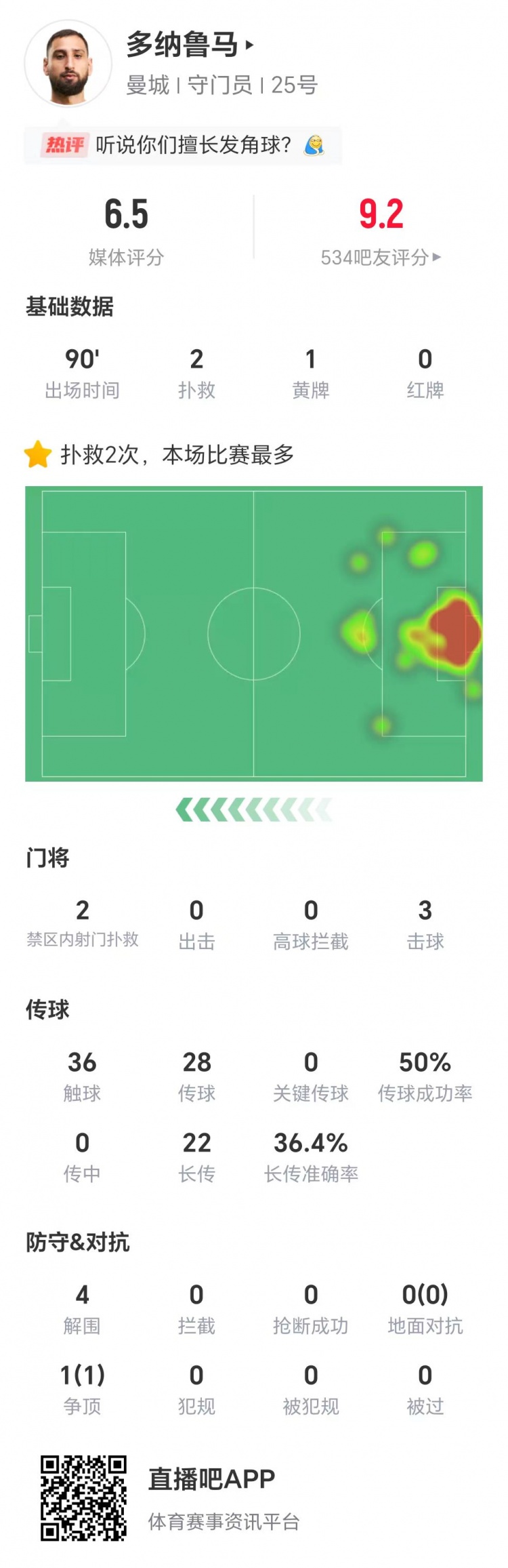 出击犹豫?多纳鲁马全场数据:两次扑救,22次长传成功率36.4%