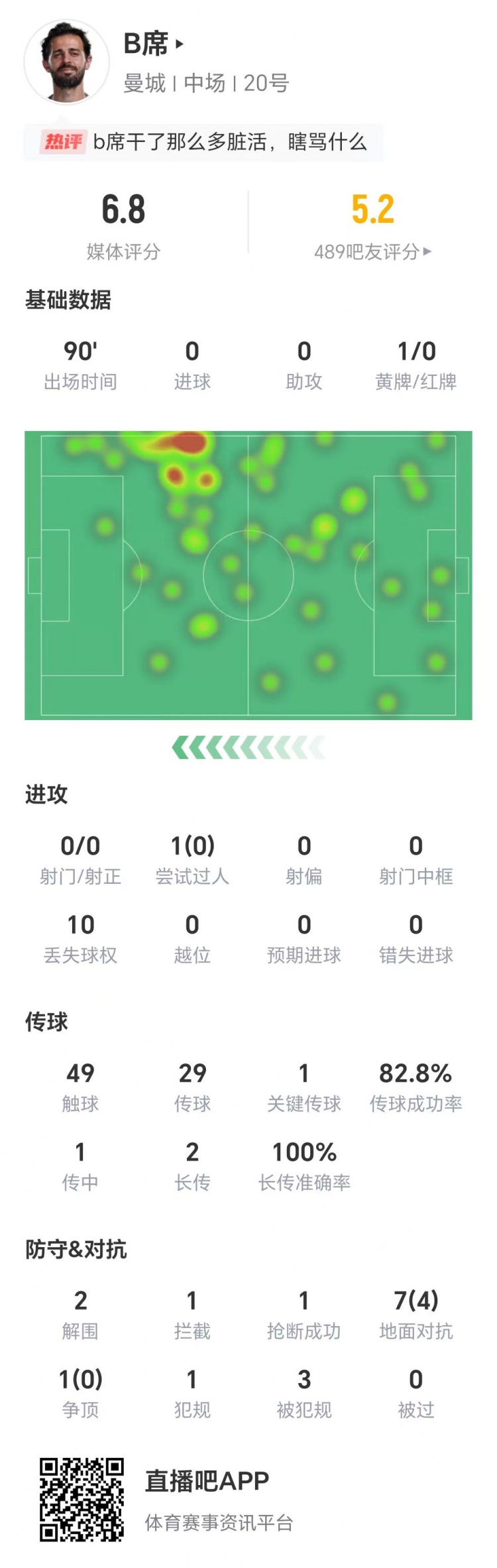 B席数据:全场零射门,1次过人未成功,1次关键传球,获评6.8分