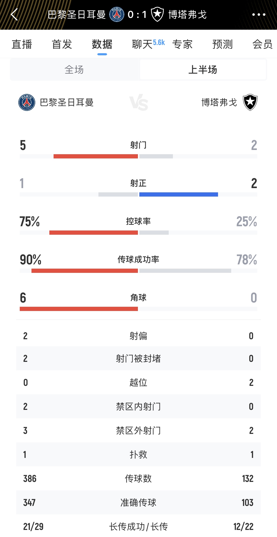 没想到!巴黎半场超7成控球率1次射正,博塔弗戈2次射正1个进球