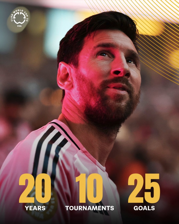 FIFA官方晒梅西数据海报,打进25球荣膺国际足联赛事历史射手王