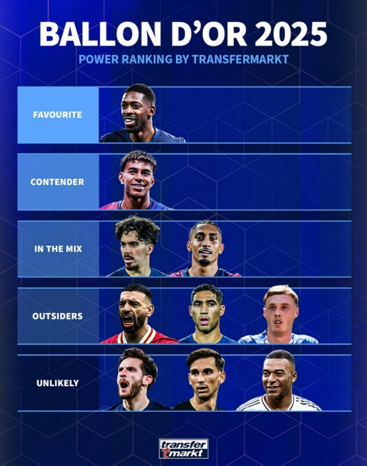 德转为金球奖竞争评级:登贝莱最被看好,亚马尔为最大竞争对手