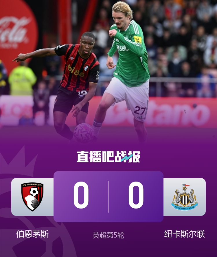 闷平!伯恩茅斯0-0纽卡暂升第3 纽卡开赛5轮仅取1胜排第13