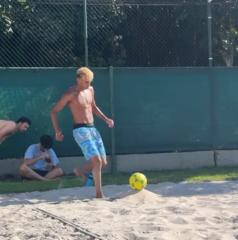 惬意时光!内马尔社媒晒出和亚马尔一起在沙地踢球的照片