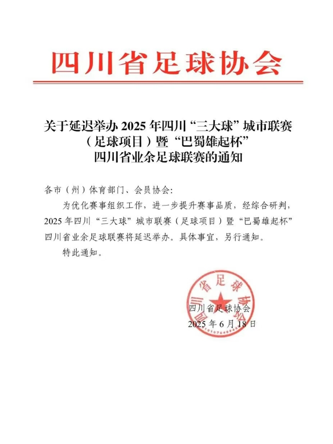06月19日讯 今日,四川省足球协会官方发布《关于延迟举办2025年四川“三大球”城市联赛(足球项目)暨“巴蜀雄起杯”四...