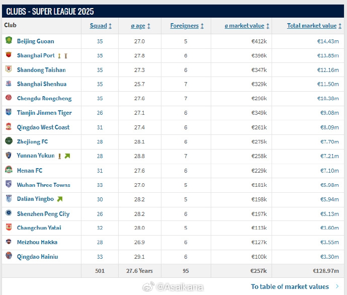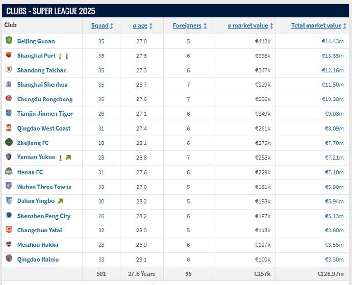 中超各队总身价:国安上涨居首海港泰山下跌,蓉城申花基本持平