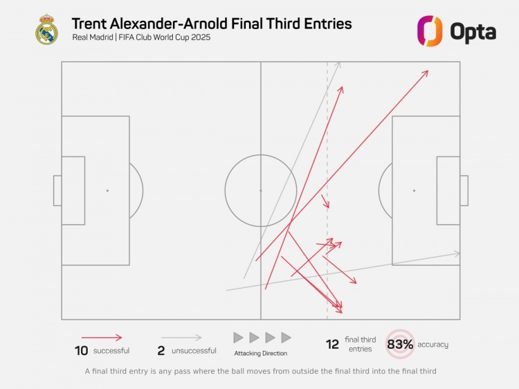 阿诺德首秀将球传入进攻三区12次,皇马队内最多&成功率83%