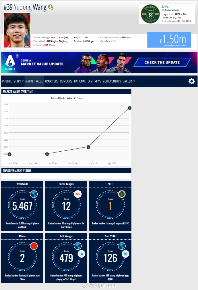 王钰栋在全球2006年出生的球员里排名第126,在全亚洲排名第4!