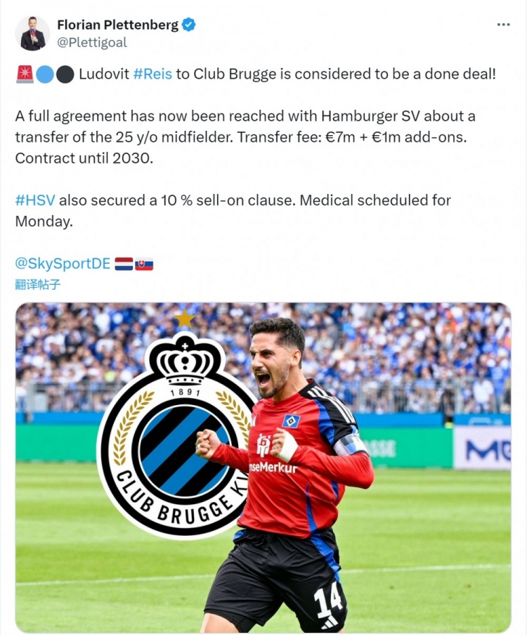 德天空:布鲁日敲定汉堡中场雷斯,转会费700万欧+100万欧浮动