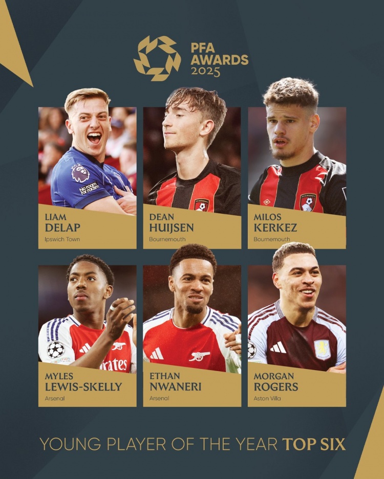PFA最佳年轻球员前六:德拉普、怀森、斯凯利、罗杰斯在列