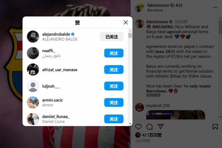 期待成为队友😜罗马诺报道尼科与巴萨谈妥个人条款,巴尔德点赞