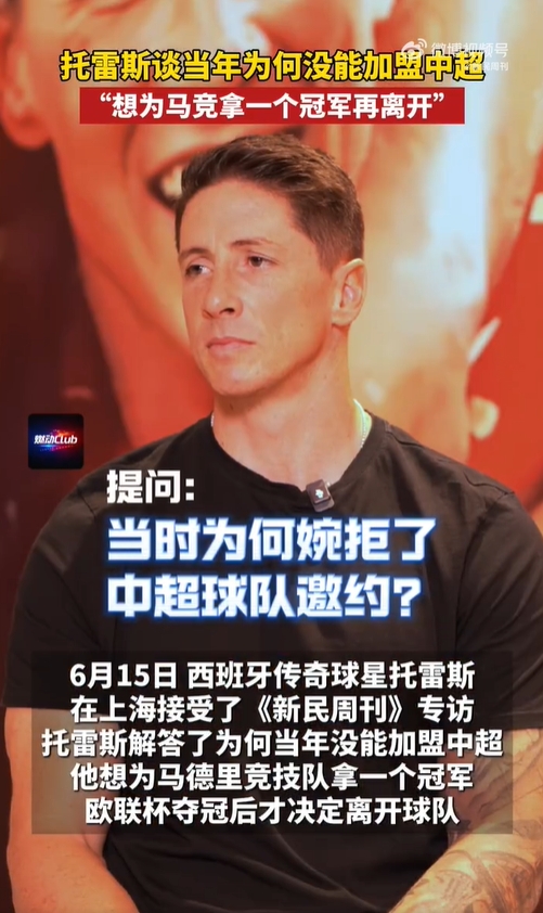 曾收到中国球队邀约!托雷斯解释为何没有加盟中超:想为马竞夺冠
