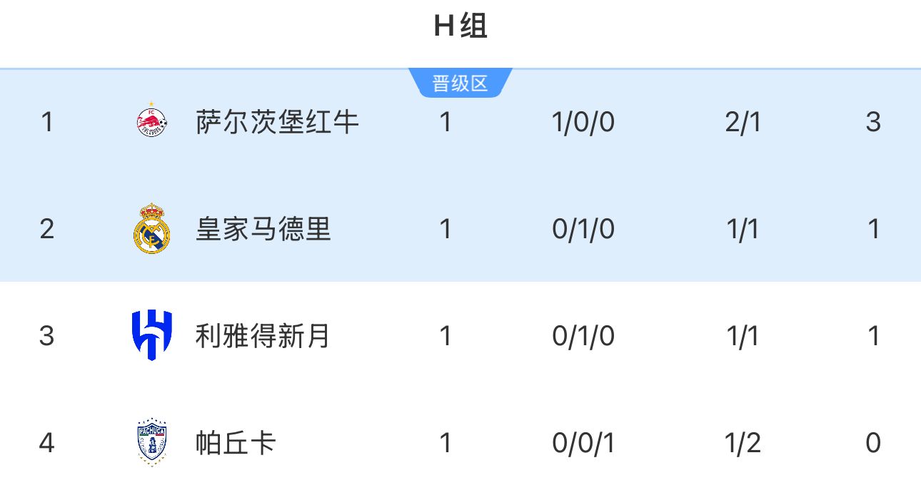 世俱杯H组积分榜:萨尔茨堡3分第一,皇马新月1分&新月黄牌多列后