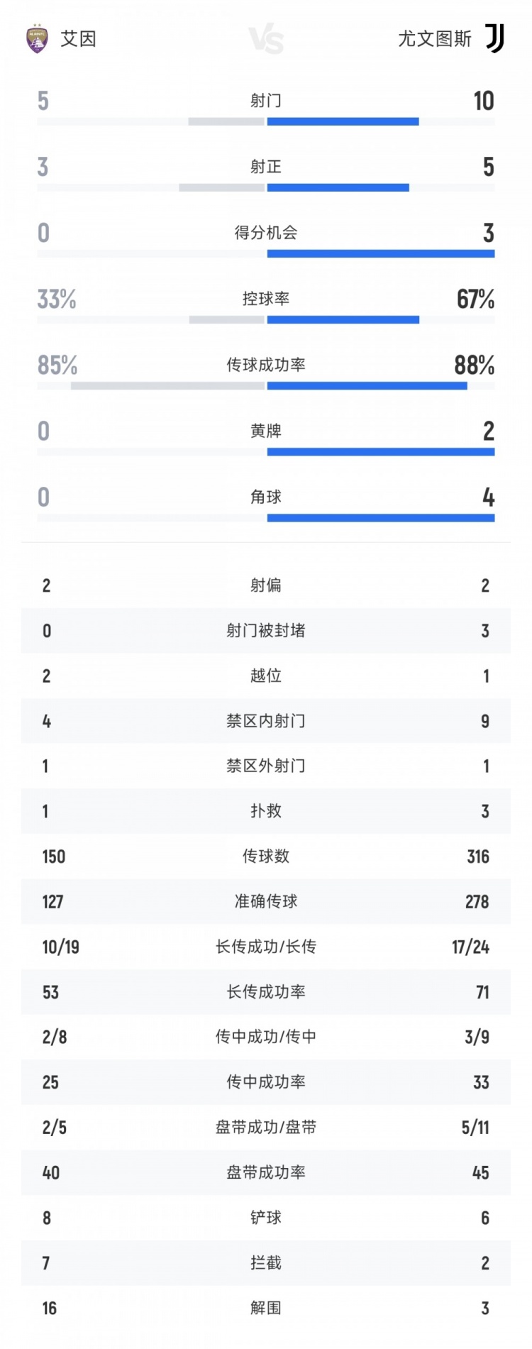 尤文vs艾因半场数据:尤文10射门5射正4进球 艾因5射门3射正