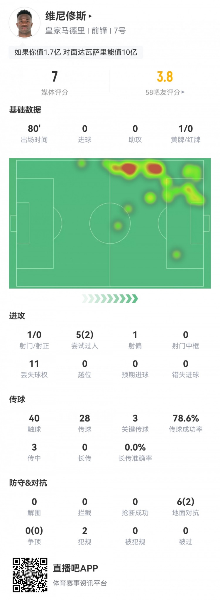 维尼修斯数据:1射0正,3次关键传球,2次过人,评分7.0