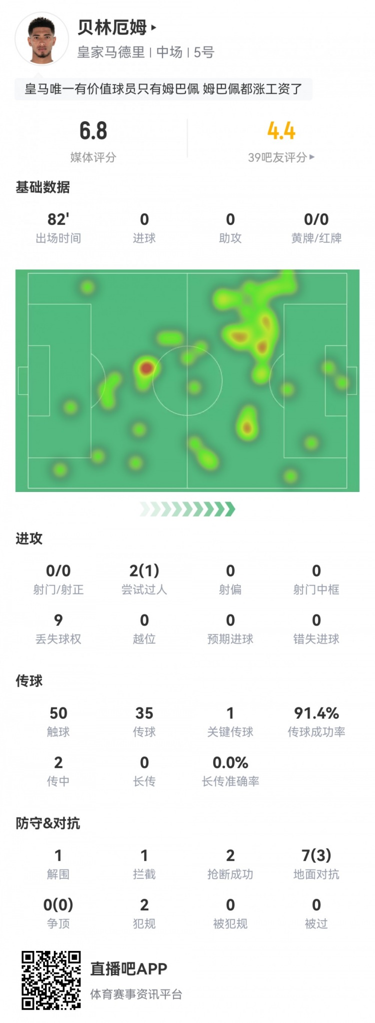 贝林厄姆数据:0射门,1次关键传球,1解围2抢断,评分仅6.8
