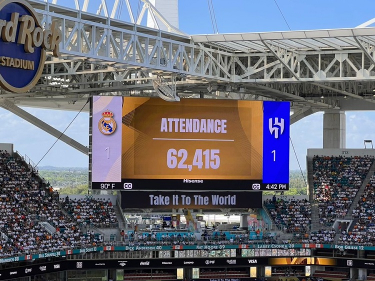 皇马1-1利雅得新月共吸引62415名球迷观赛,球场最多能坐67518人