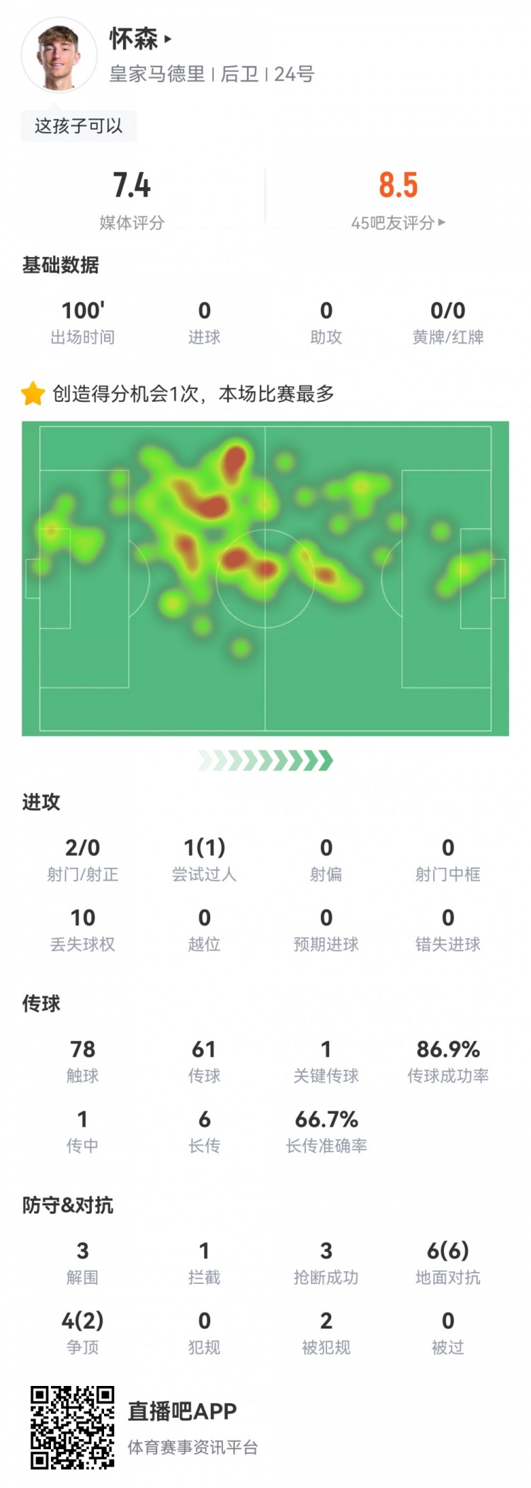 怀森皇马首秀数据:1关键传球,3解围&抢断,8成功对抗,评分7.4