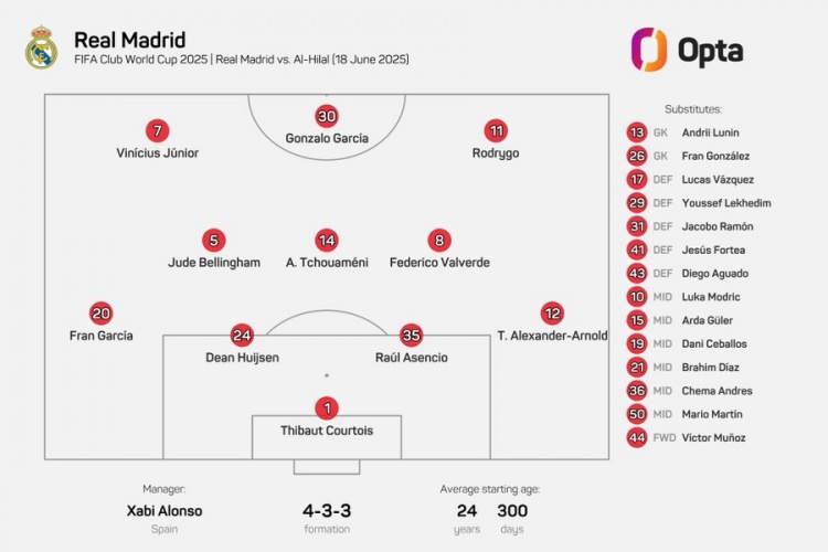 6月19日讯 北京时间今天凌晨3点,世俱杯小组赛首轮皇马对阵利雅得新月,此役双方首发已公布。据opta数据统计,本场比赛...