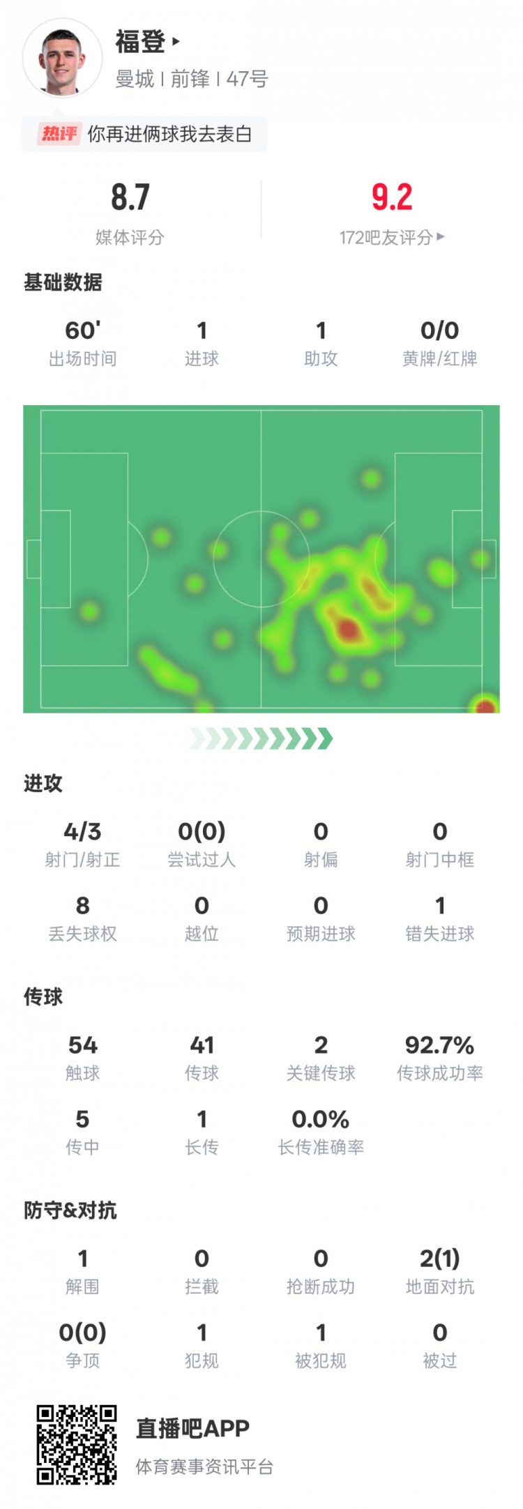 福登本场数据:传射建功+2关键传球&传球成功率92.7%,评分8.7